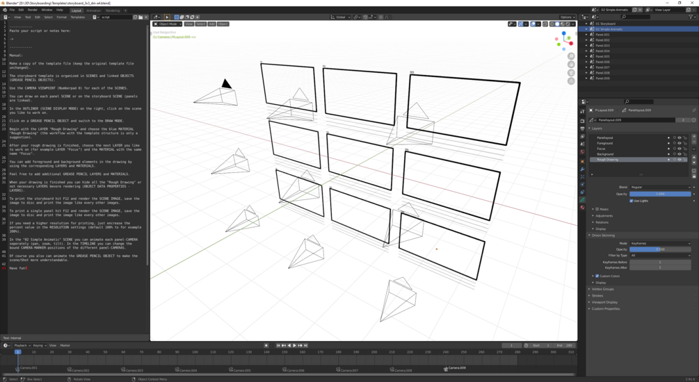 A ready to work storyboard template using the grease pencil feature in Blender with a simple animatic option in two output formats - DIN A4 and Letter.