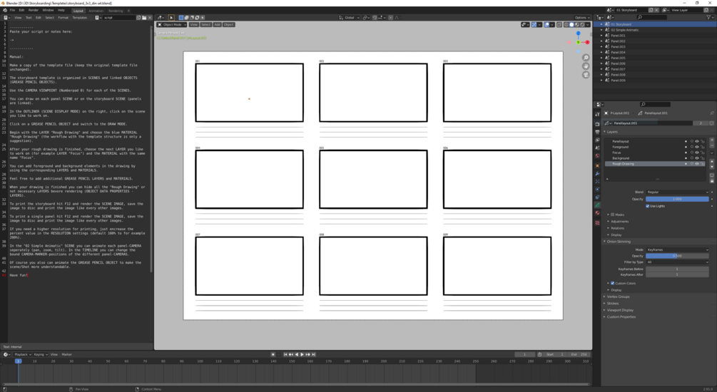 A ready to work storyboard template using the grease pencil feature in Blender with a simple animatic option in two output formats - DIN A4 and Letter.