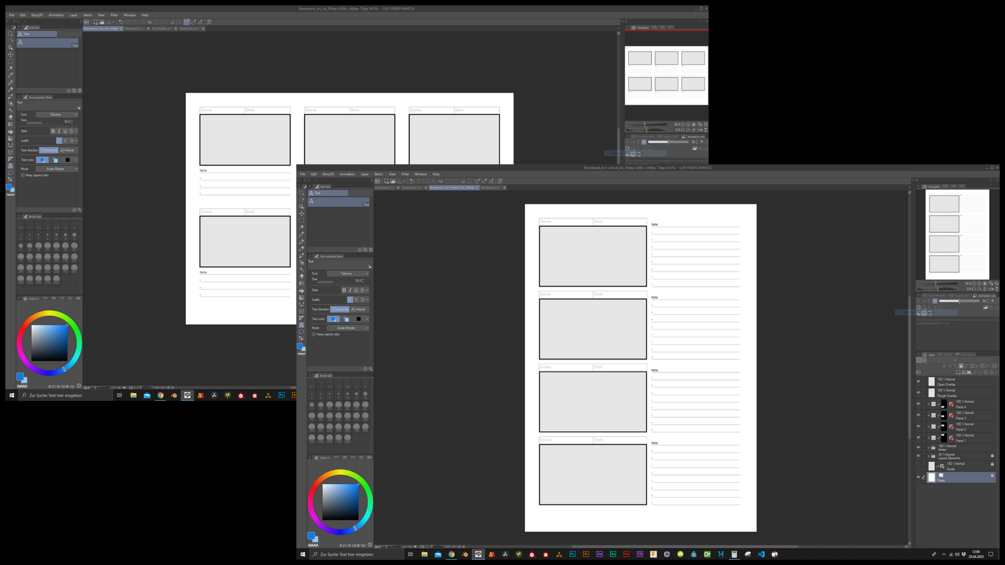 Two widely used templates (3x2 and 4x1) in two formats (A4 and US Letter) for creating perfect structured storyboards in Clip Studio Paint. You can combine the templates with the "Story" feature (only EX) in Clip Studio Paint EX for managing all storyboard pages.